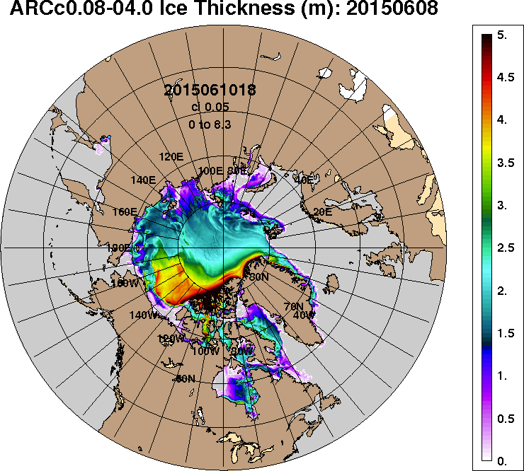 The 30-day animation below further illustrates this dramatic fall in sea ice thickness (from June 8-29, with forecast up to July 7, 2015).