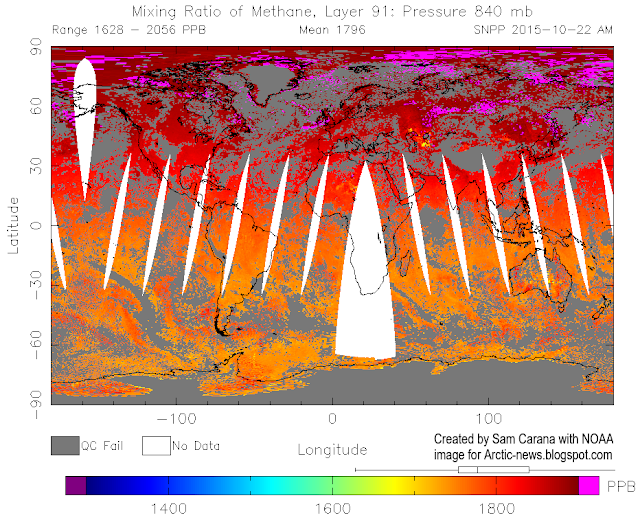 Above image shows methane levels at low altitude on October 22, 2015. Because of its height, there are no data at this altitude for Greenland. The image below shows methane concentrations at a higher altitude, with high methane levels showing up over Greenland on October 16, 2015.