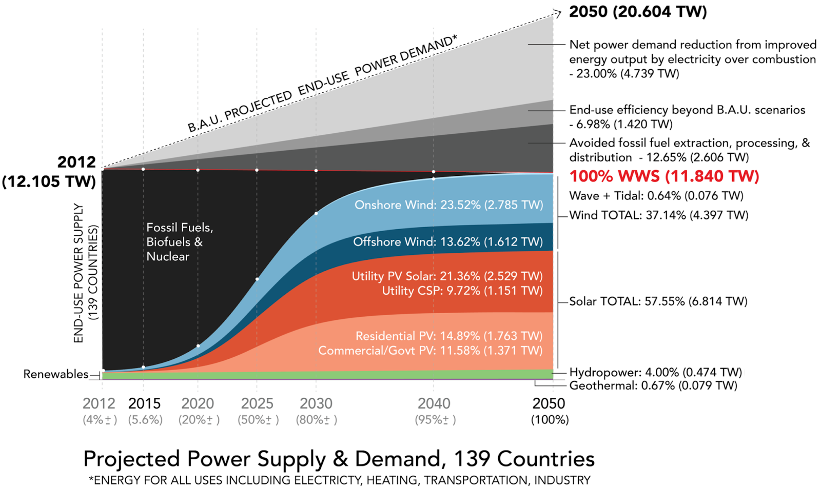 The image below shows that a shift to 100% clean (WWS) energy by 2050 (80% by 2030) could reduce CO2 to ~350 ppmv by 2100.